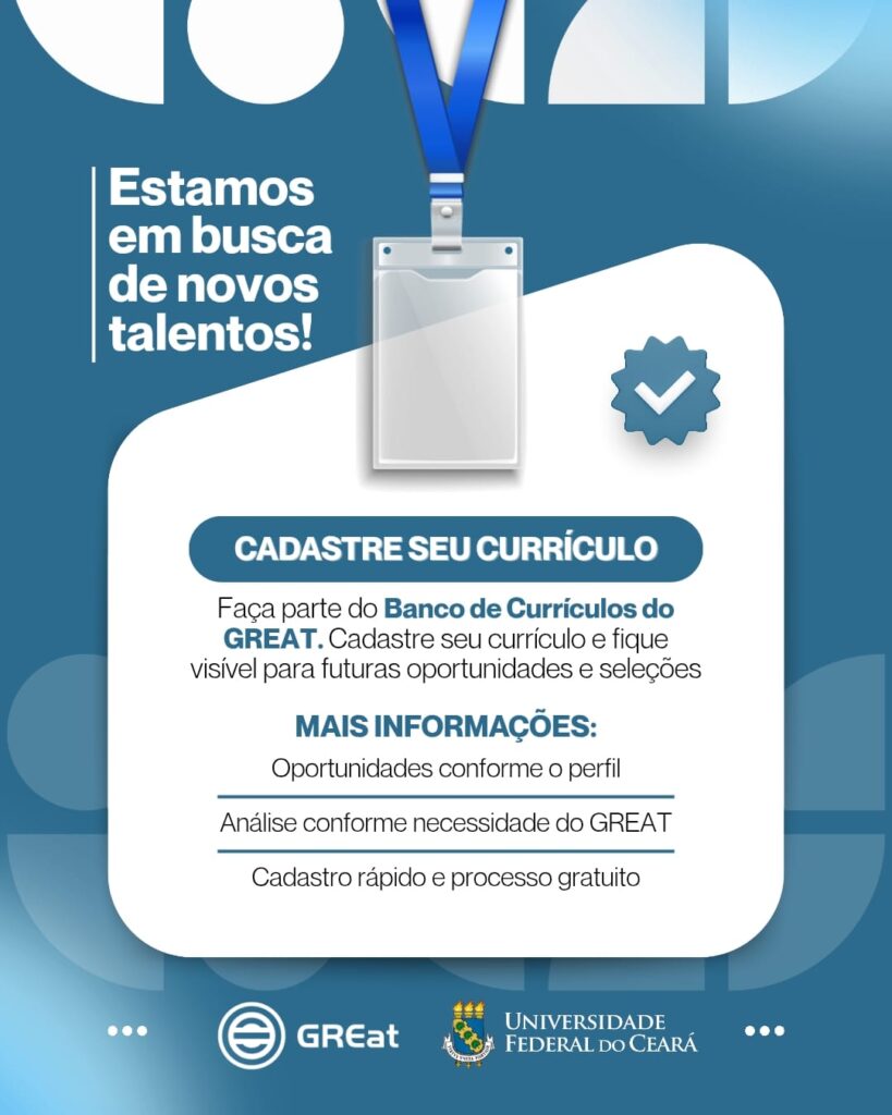 O GREat tem a alegria de anunciar a criação do nosso Banco de Currículos. Nessa plataforma você poderá enviar seu currículo, que será considerado para avaliação nas próximas vagas de trabalho e bolsas oferecidas pelo GREat.
